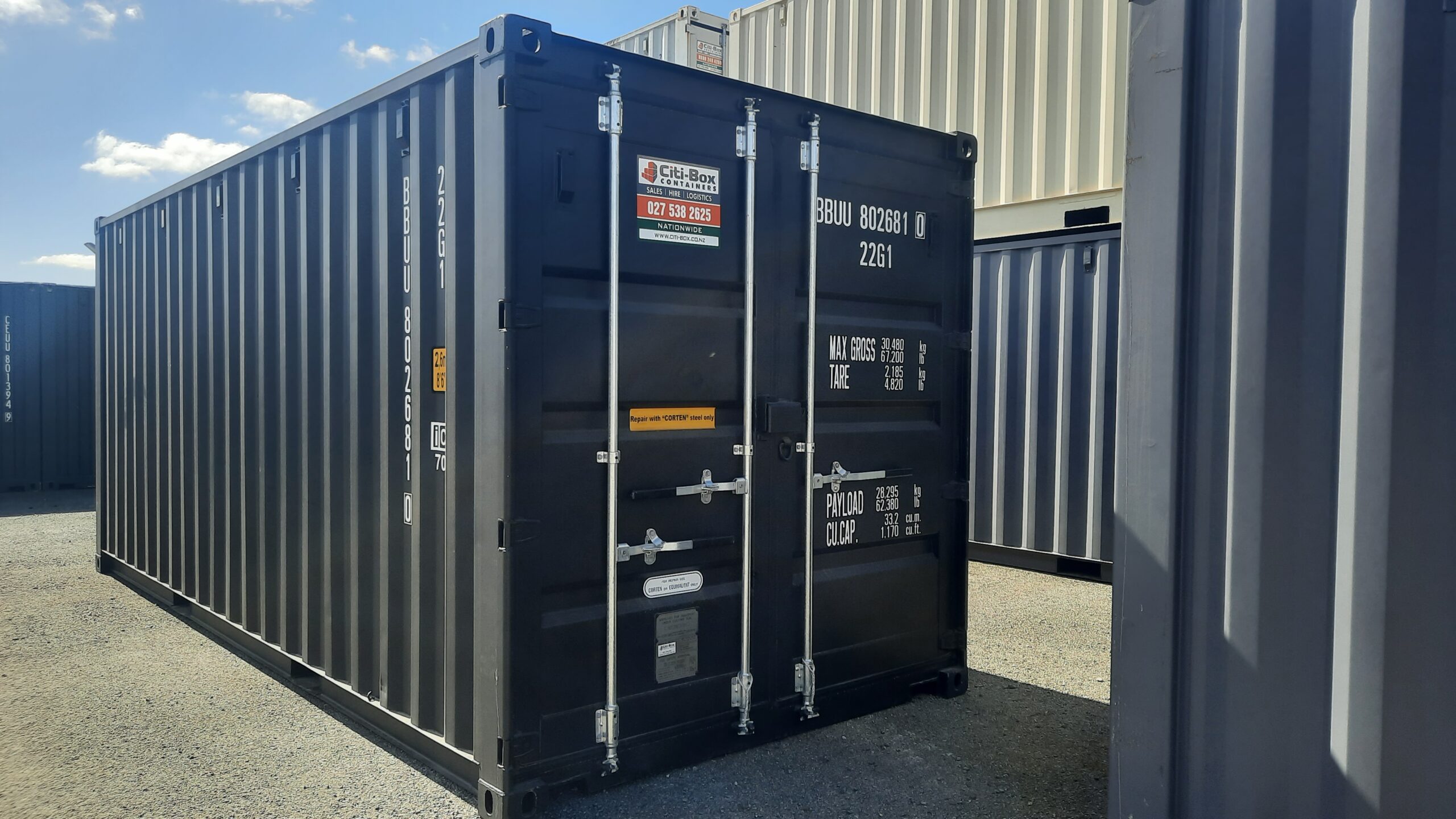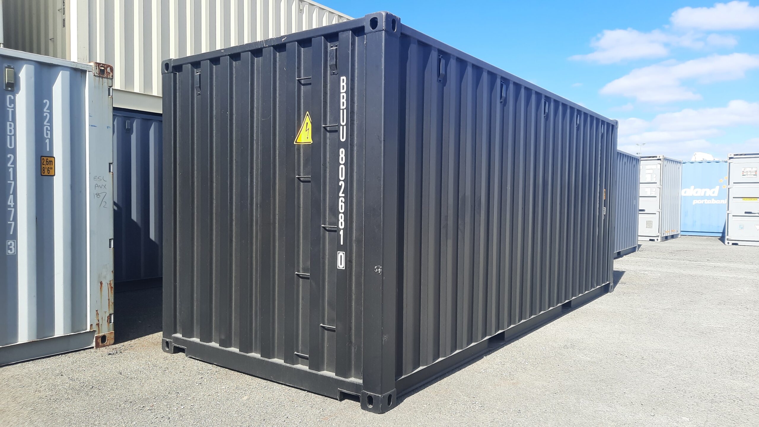 In stock now, these 20′ shipping containers are in near new condition, having only done one trip (new ex factory from overseas port). They are a great general purpose storage container, factory fitted with 14 of the equalizing vents and also a lock box for added security for your padlock; waist-high handles with rubber grips. Photos are of the actual containers. Also available in sandstone, blue, grey or beige.